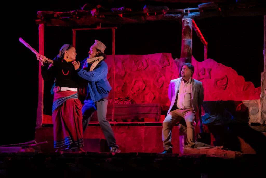 However, theatre practitioners need to be more experimental and find new ways to expand the intellectual horizon of plays even while retaining the aspects that cater to the libidinal. An example of such a play is Rio, one of the entries of the Nepal International Theatre Festival (NITFest). This Uruguayan play by Andrés Fagiolino and Betina Dominguez dealt with the serious issue of the water crisis through the masterful use of fun elements. During the performance, the actors broke the fourth wall, used empty cups gathered from several countries signifying the global water crisis, and used extreme physical movements inspired by circus acts. The play kept the audience engaged while giving ample space for further intellectual discourse. There are some more plays performed in Nepal that I have found to be intellectually stimulating while also experimenting with the form. I would like to write about three such plays here.