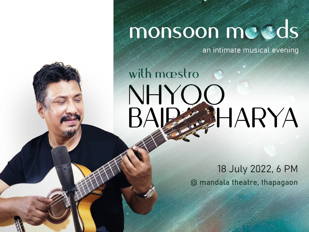 Monsoon Moods is an intimate musical evening show by born music talent Nhyoo Bajracharya.  Mandala is going to host this event in its auditorium having capacity of 170 audiences with luxury seating arrangements. The show has been scheduled for 2022 July 18 (2079 Shrawan 2) from 6 pm in the evening.